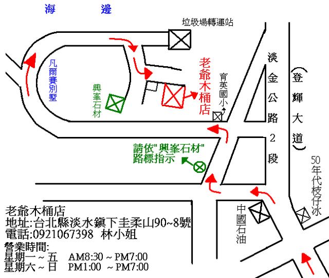 | 各位網友大家好!老爺木桶店於2006年10月搬家摟!如果您不知道如何到我們新廠,請參考下面說明,未來我們會加入更多交通資訊。 以下是交通資訊說明: Hello! The User, If you like LAOYEH, Welcome to visit as follows: 台北縣淡水鎮義山里11鄰下圭柔山90-8號 電話:02-26232169 行動:0921067398 地圖: ![]() 搭車: 捷運淡水站下車,出口後右邊直走搭淡水鎮公所免費社區巴士 7號車在【凡爾賽別墅站】下車,步行即可到達。 3號車在【林子站】下車,來電派車接送。 捷運站對面萬熹飯店門口搭乘淡水客運,往金山、三芝在育英國小下車,來電派車接送。 開車: 走登輝大道右邊先看到【50年代枝仔冰】往前一點左邊中國石油加油站左轉,遇到第一個紅綠燈右轉,再來第一個紅綠燈左轉,接著請看路標,沿著【興峯石材】路標走即可到達。 |